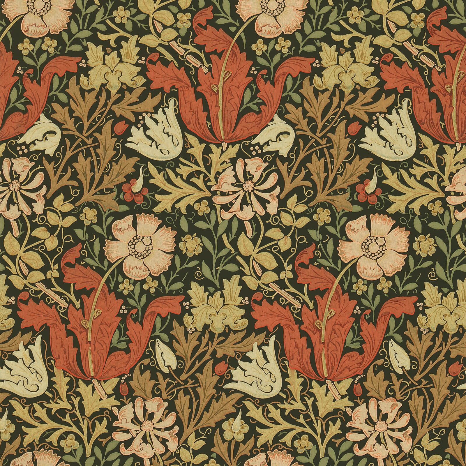 Compton was designed by John Henry Dearle in 1895, especially for Compton Hall in Wolverhampton the home of Laurence Hodson. The original design required two sets of wood blocks to print all 28 colours owing to the large vertical repeating pattern but has since been scaled down and adapted for a wider audience.