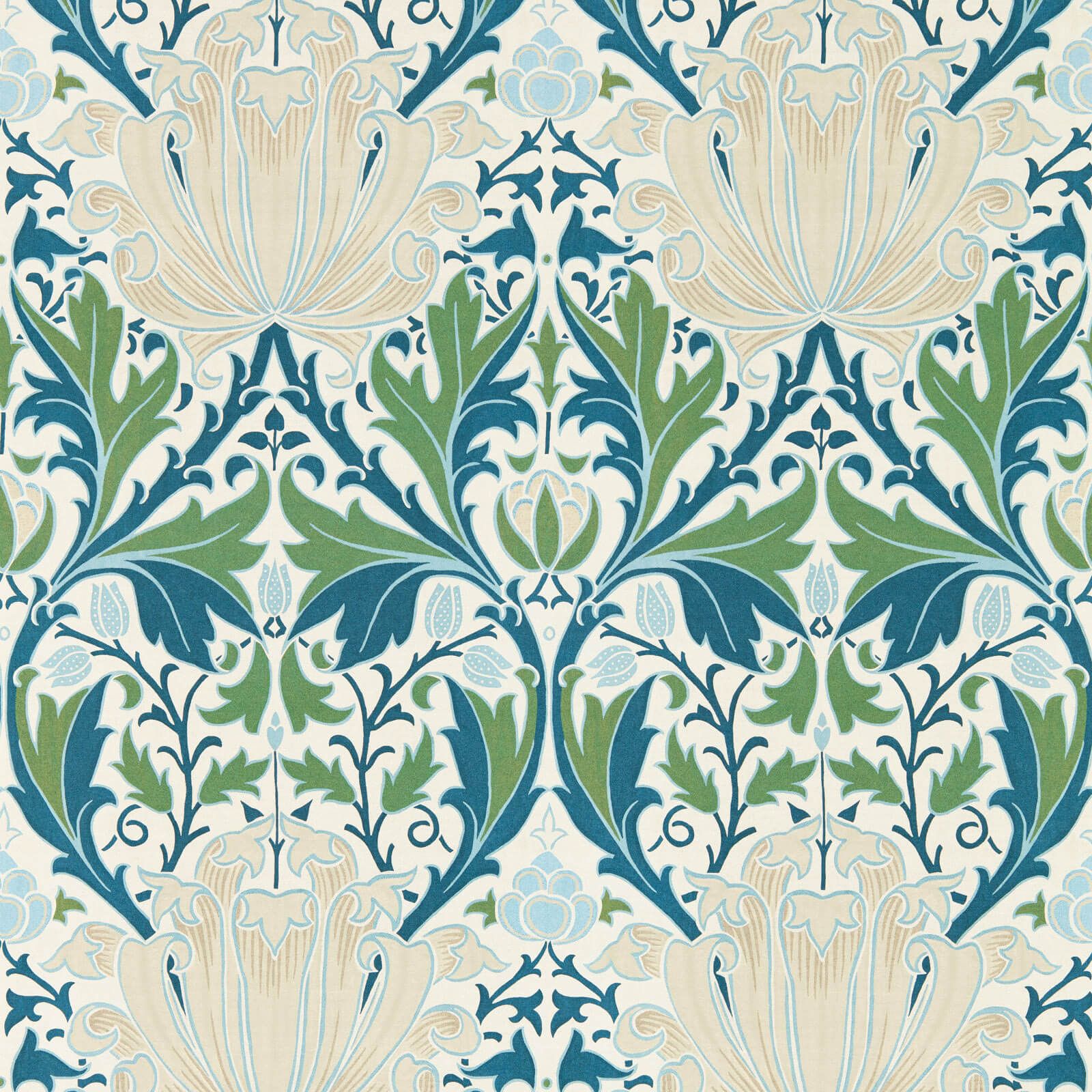 J. H Dearle's vision for Helena designed in 1891 as a woven jacquard reflects his profound fascination with the detailed textiles of Persia and Turkey which held his gaze during his peak as a designer. The intricate pattern seamlessly blends artichoke flowers against a backdrop of acanthus leaves and fritillaries.