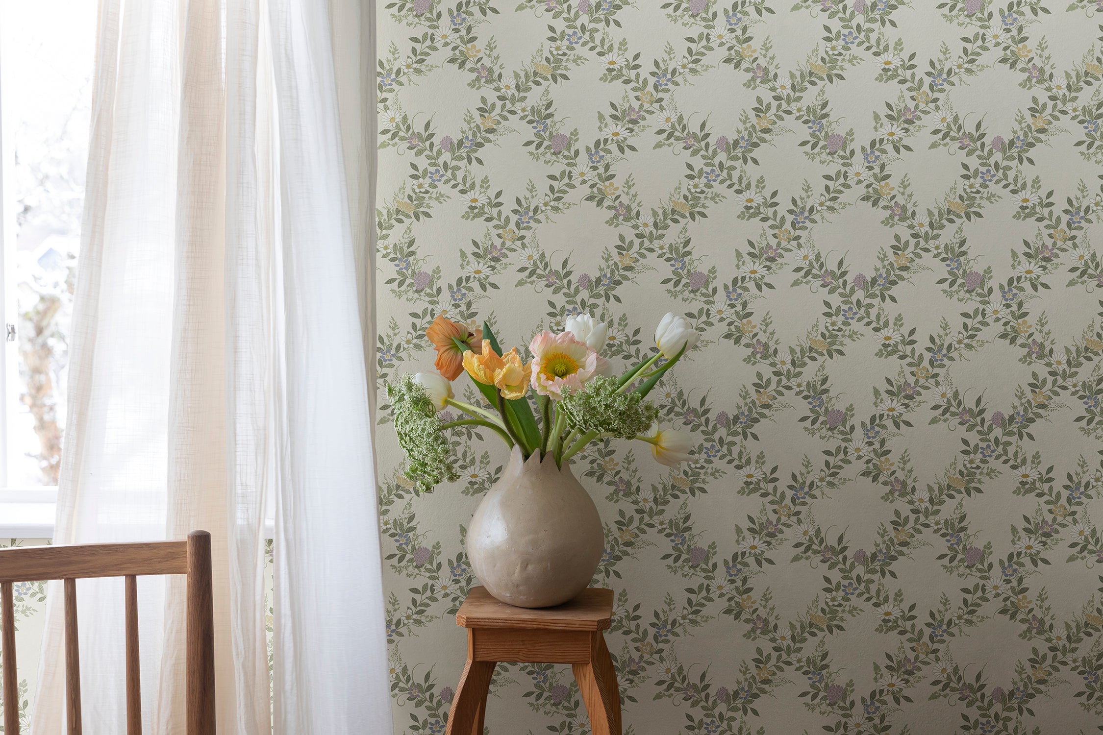 Suvistest aasalilledest moodustuv trellisemustriline tapeet.